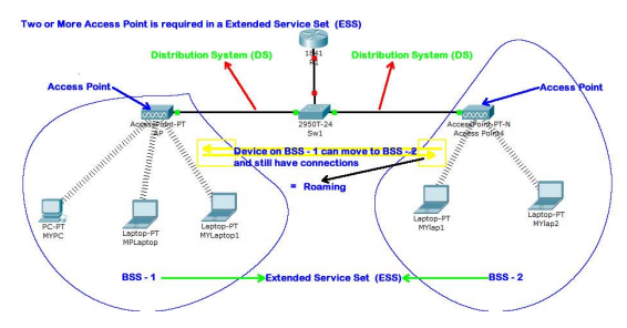 - ESS (Extended Service Set): Merupakan gabungan dari dua atau lebih BSS yang terhubung melalui sebuah Distribution System (DS), yang biasanya berupa jaringan kabel. Dari sudut pandang pengguna, seluruh ESS terlihat seperti satu jaringan tunggal yang luas. ESS memiliki satu nama jaringan (SSID) yang sama untuk semua AP di dalamnya. Tujuan utamanya adalah untuk memfasilitasi roaming, yaitu kemampuan pengguna untuk berpindah dari area cakupan satu AP ke AP lain secara mulus tanpa kehilangan koneksi