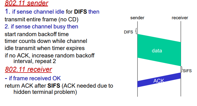 - Jika channel kosong selama periode waktu tertentu yang disebut DIFS (Distributed Inter-Frame Space), stasiun akan mengirimkan seluruh frame datanya.