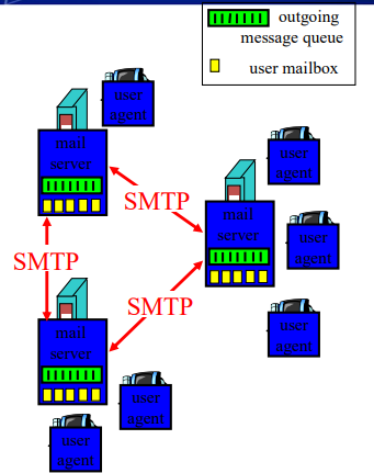 - Sistem email terdiri dari tiga komponen: User Agents (klien seperti Outlook), Mail Servers (penyimpanan dan relay), dan protokol SMTP yang berfungsi untuk “mendorong” (push) email antar server.