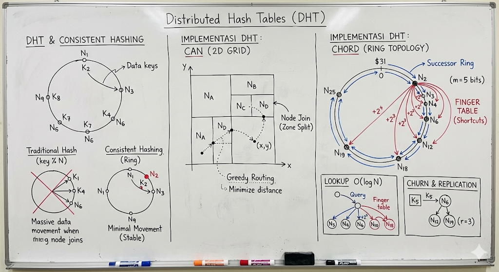 Sistem Pencarian Terdistribusi berevolusi dari model sentral (rawan mati) dan flooding (boros bandwidth) menjadi Distributed Hash Tables (DHT) yang efisien. CAN menggunakan pendekatan grid geometri d-dimensi dengan routing tetangga. Chord menggunakan topologi cincin dengan pointer Successor untuk kepemilikan data dan Finger Table (lompatan eksponensial ) untuk mempercepat lookup menjadi O(log N). Keduanya menggunakan Consistent Hashing untuk meminimalkan perpindahan data saat terjadi perubahan topologi jaringan (churn).