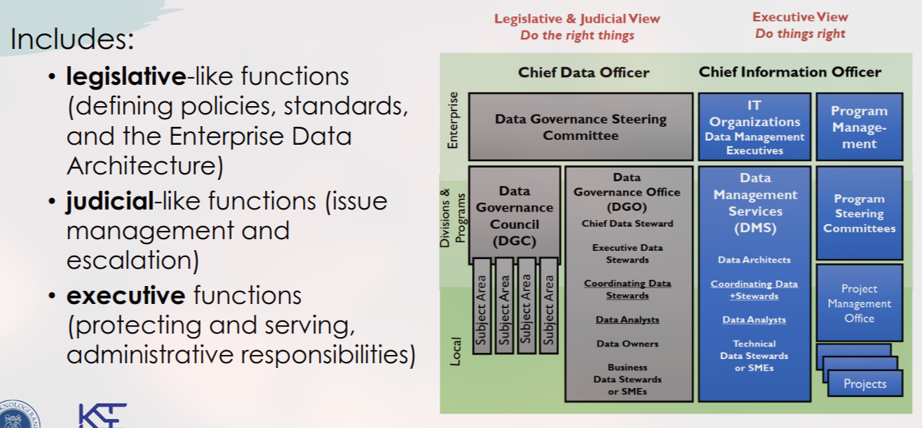 Legislatif: Menetapkan kebijakan, standar, dan Arsitektur Data Enterprise. (Contoh: “Do the right things”).