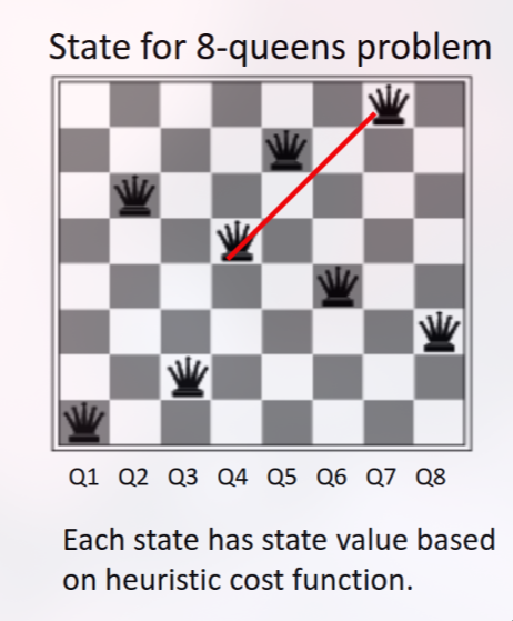 Pada gambar di atas, hanya ada satu pasang ratu yang saling serang (Q4 dan Q7), sehingga nilai heuristik untuk state ini adalah h = -1.