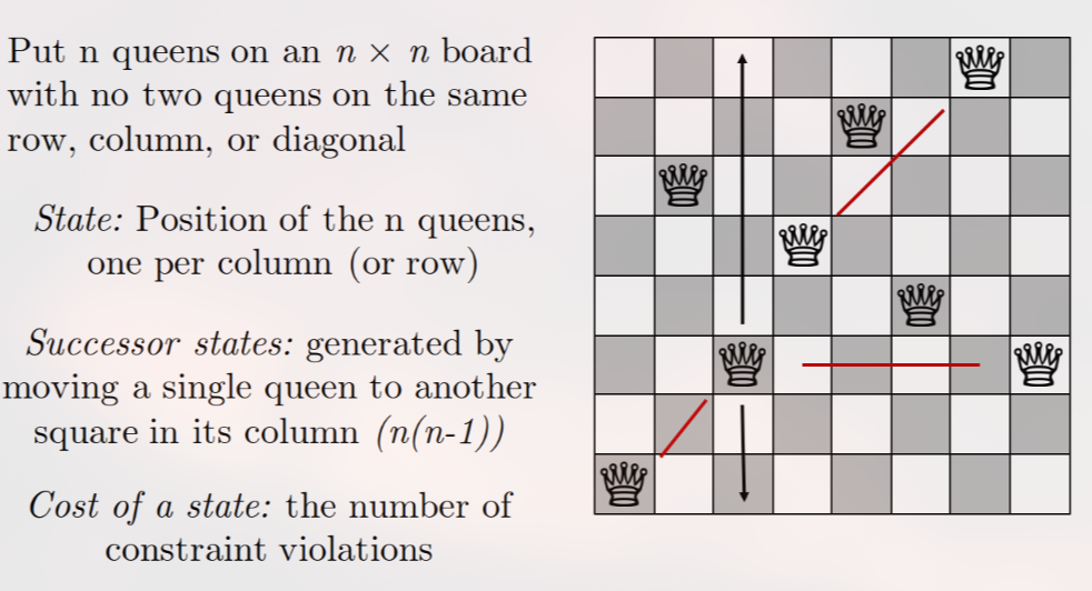 h(jumlah pasangan ratu yang saling serang) untuk konfigurasi tersebut.Pikirkan masalah lain, misalnya Traveling Salesperson Problem (TSP). Apa yang akan menjadi representasi state yang lengkap? Bagaimana Anda mendefinisikan successor dan neighbor? Apa fungsi heuristik (