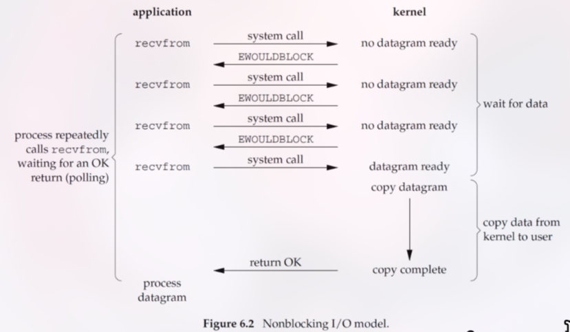 recvfromhingga data selesai disalin ke buffer aplikasi. Ini adalah model paling sederhana namun paling tidak efisien untuk konkurensi.2. Non-blocking I/O