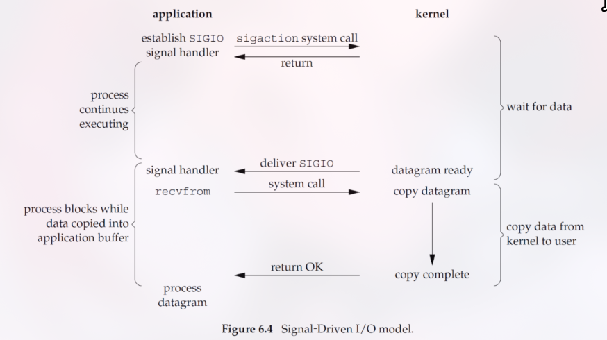 selectataupoll) untuk memonitor banyak socket sekaligus. Proses akan terblokir pada panggilanselectini sampai setidaknya salah satu socket siap untuk I/O (fase 1 selesai). Setelah itu, proses memanggilrecvfrompada socket yang siap, di mana ia akan terblokir sebentar selama data disalin (fase 2). Ini memungkinkan satu thread menangani banyak koneksi.4. Signal-driven I/O